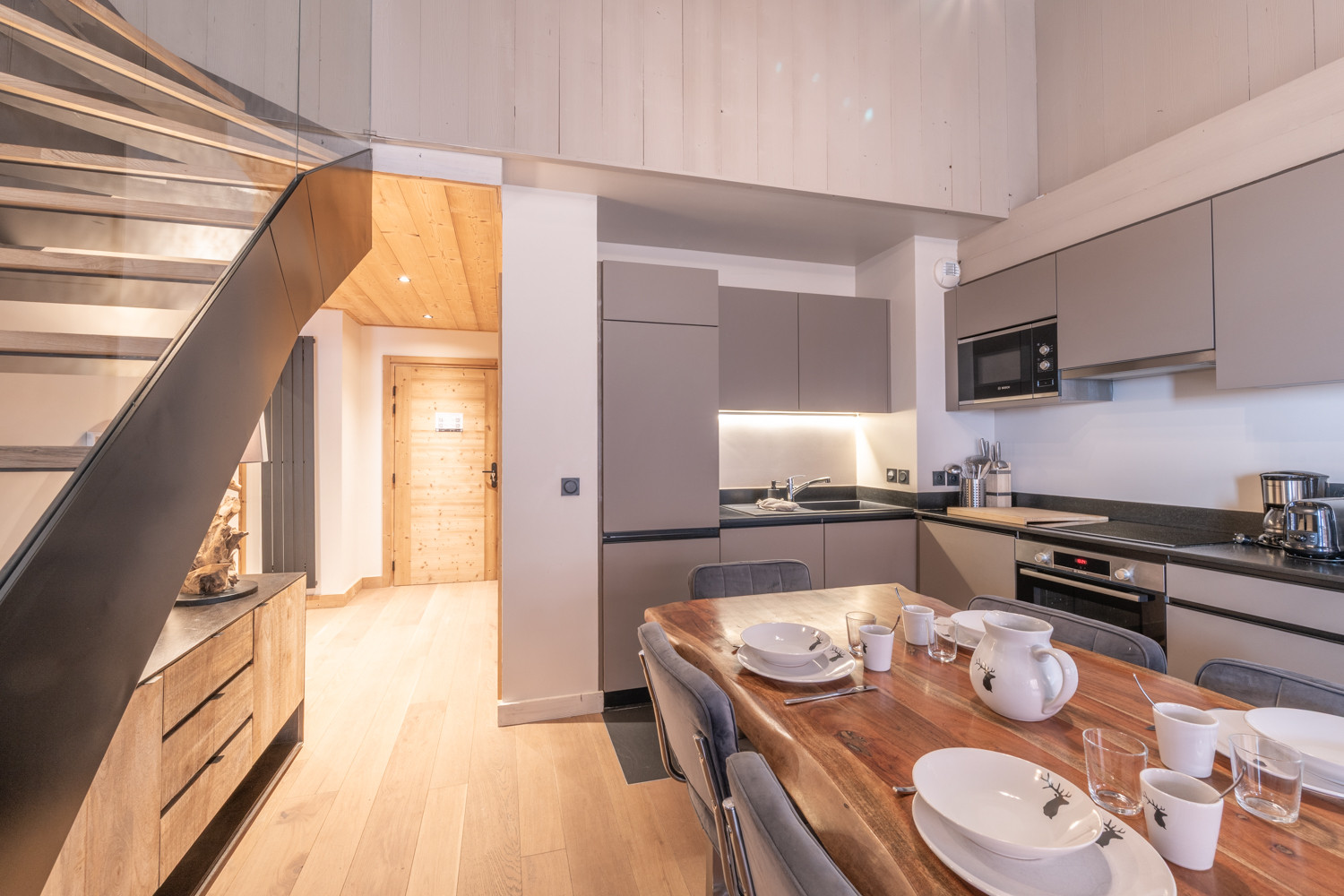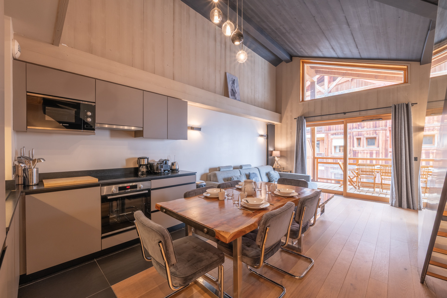 La cuisine américaine ouverte sur la pièce à vivre est entièrement équipée (grille-pain, bouilloire, Nespresso et cafetière à filtre, appareils à fondue et raclette, presse-agrumes électrique etc.).