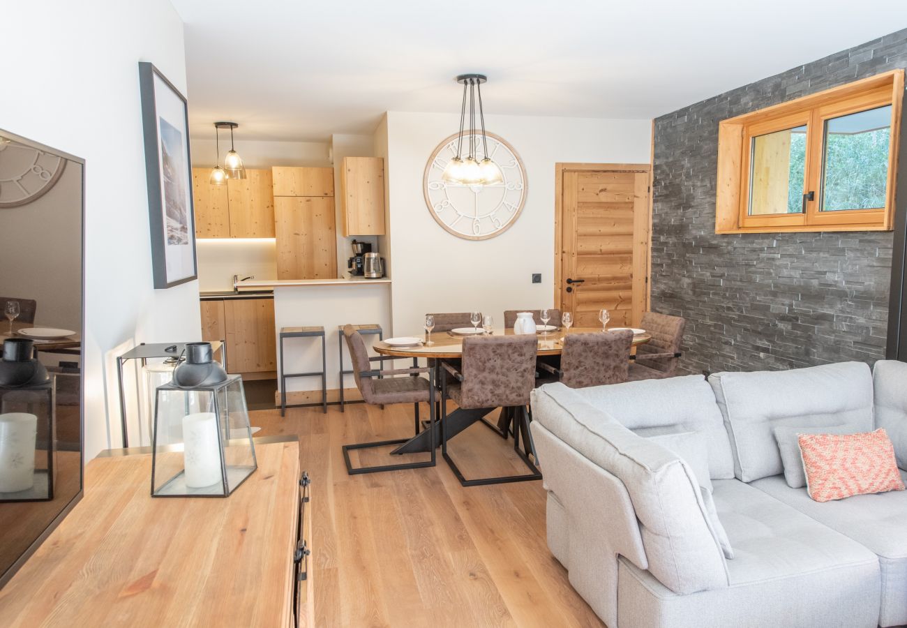 Sa cuisine, ouverte sur le séjour, est totalement équipée (grille-pain, bouilloire, Nespresso, cafetière à filtre; presse-agrumes, appareils fondue et raclette) et le salon sont idéals pour partager des moments en famille. Un balcon exposé est équipé de mobilier extérieur vous permet de profiter des belles matinées ensoleillées.