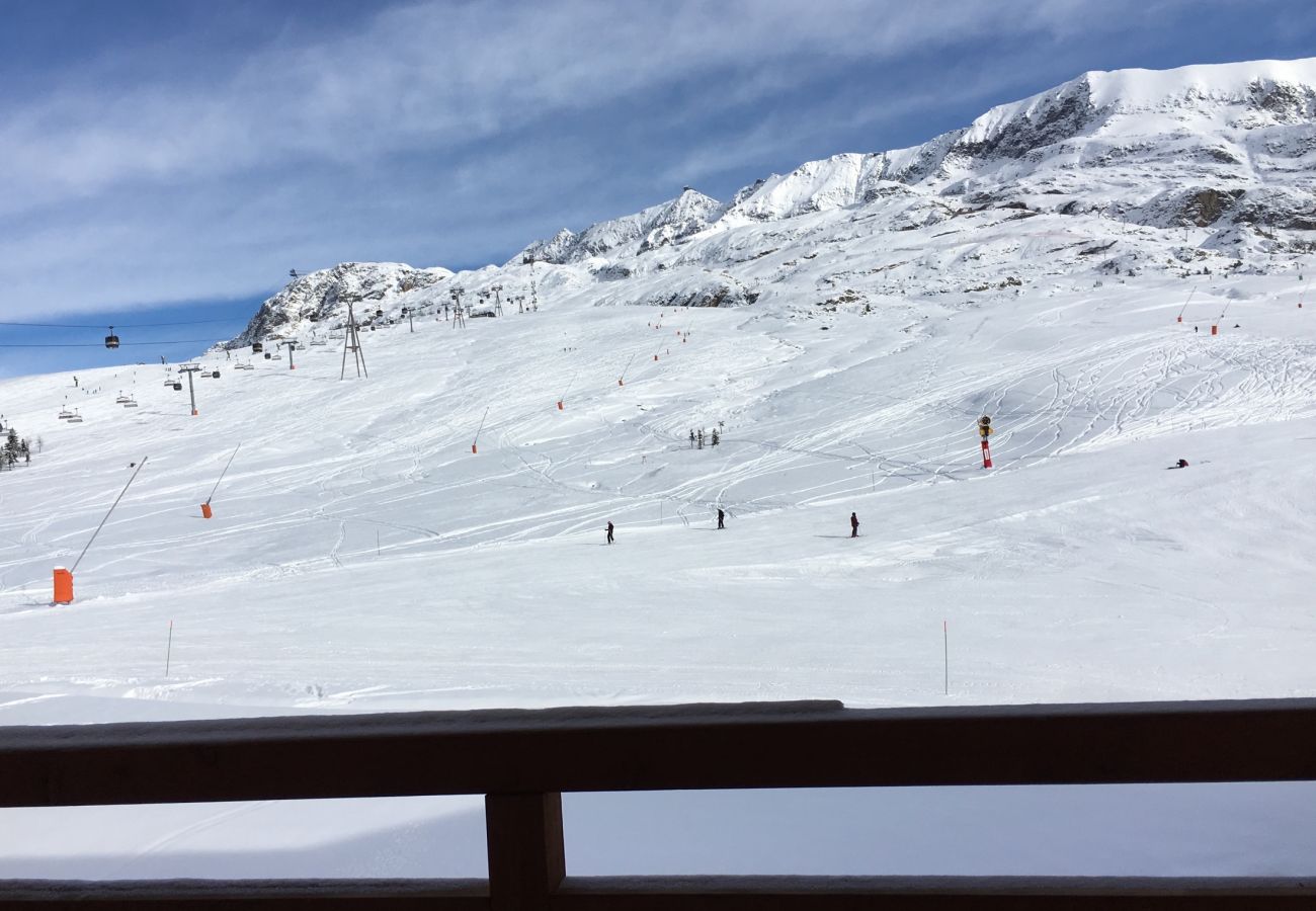 Emplacement idéal pour partir les skis aux pieds. Le balcon est à l’ombre mais ce n’est pas bien important car dans la journée on est sur les pistes !!!