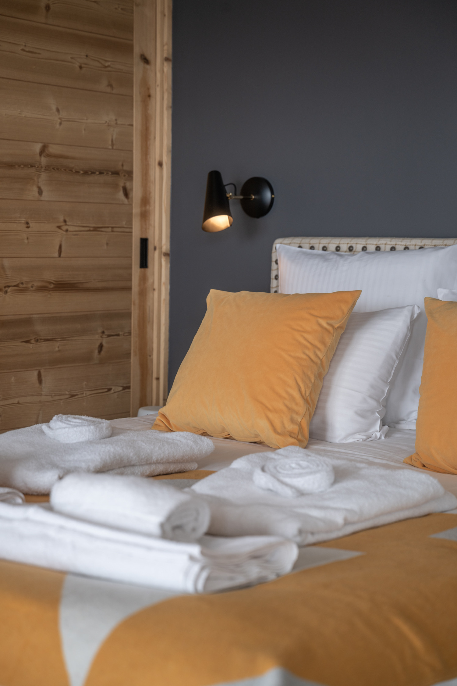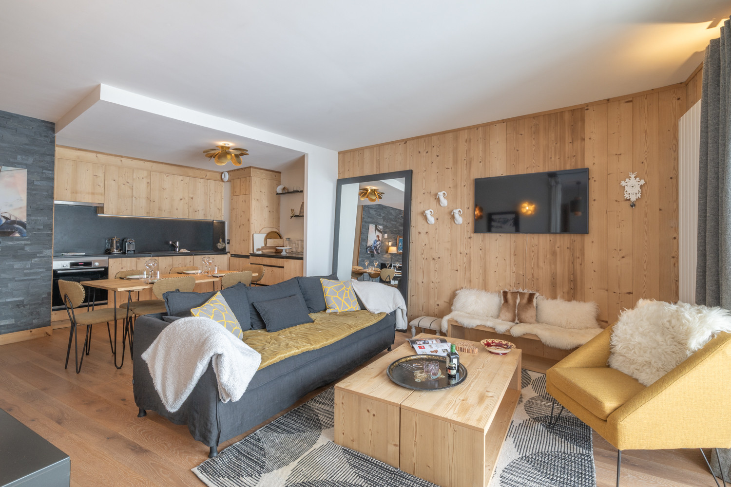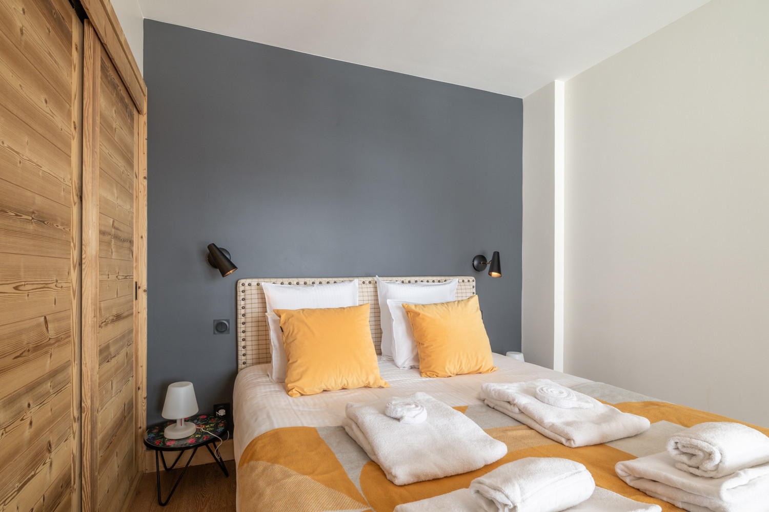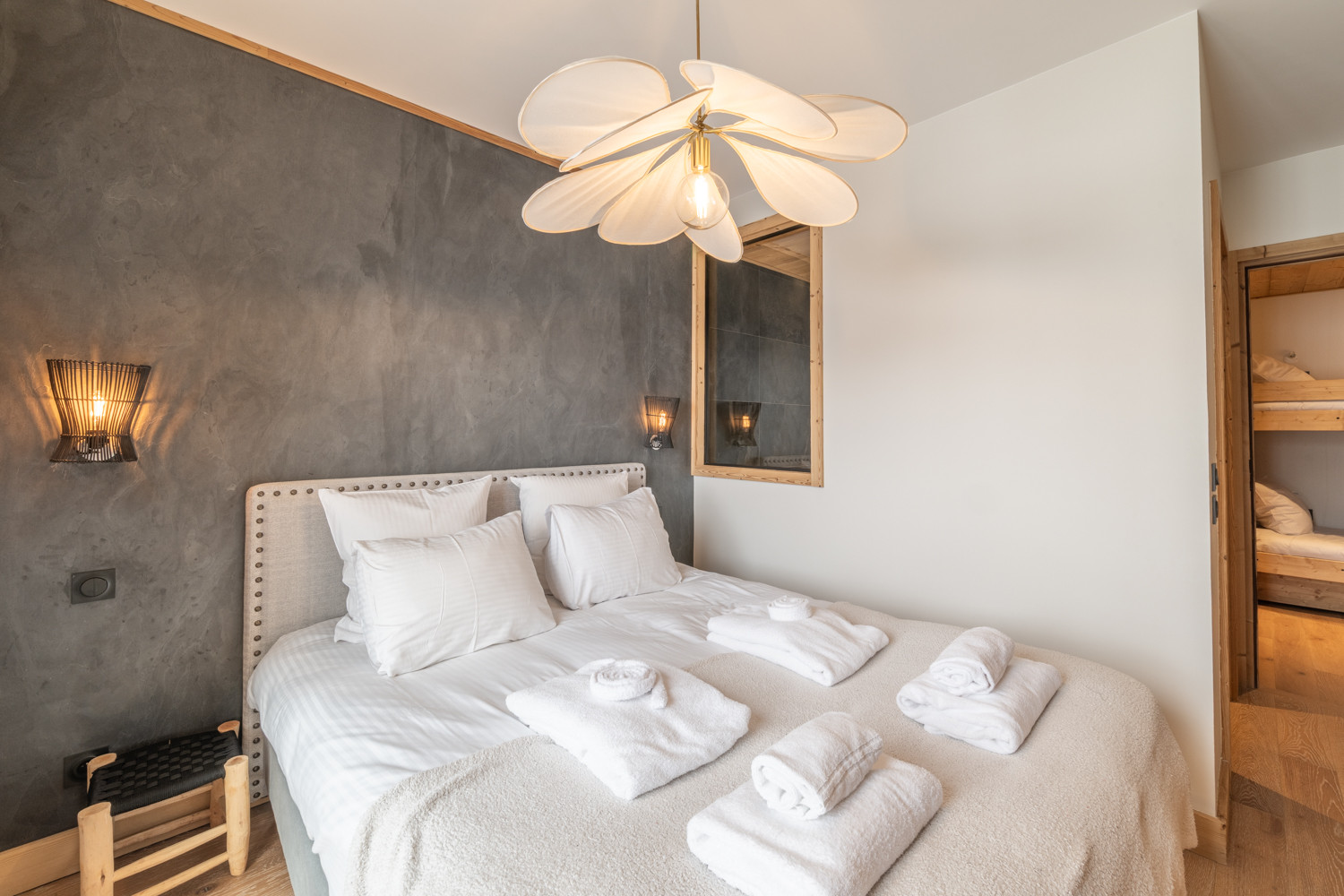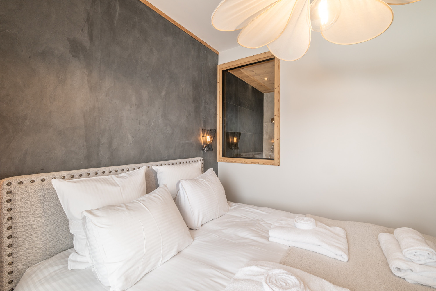 The apartment can accommodate up to 6 guests. It features two double bedrooms, including a master suite with an en-suite bathroom. The second double bedroom is open to the living area: it is not fully enclosed and is separated from the lounge by a curtain, providing a comfortable sleeping area while remaining connected to the living space. A mountain-style sleeping area in the hallway completes the sleeping arrangements, along with a shower room and a separate toilet.