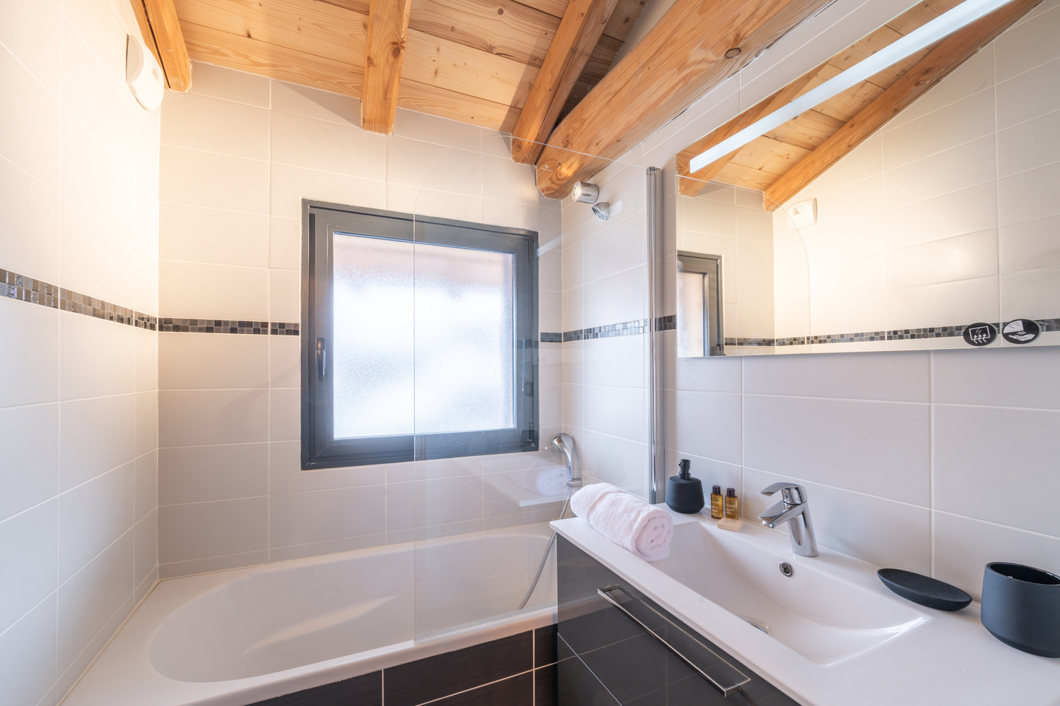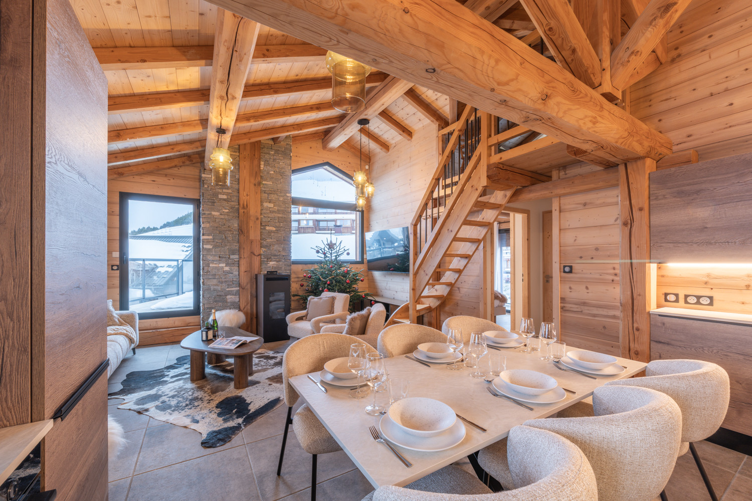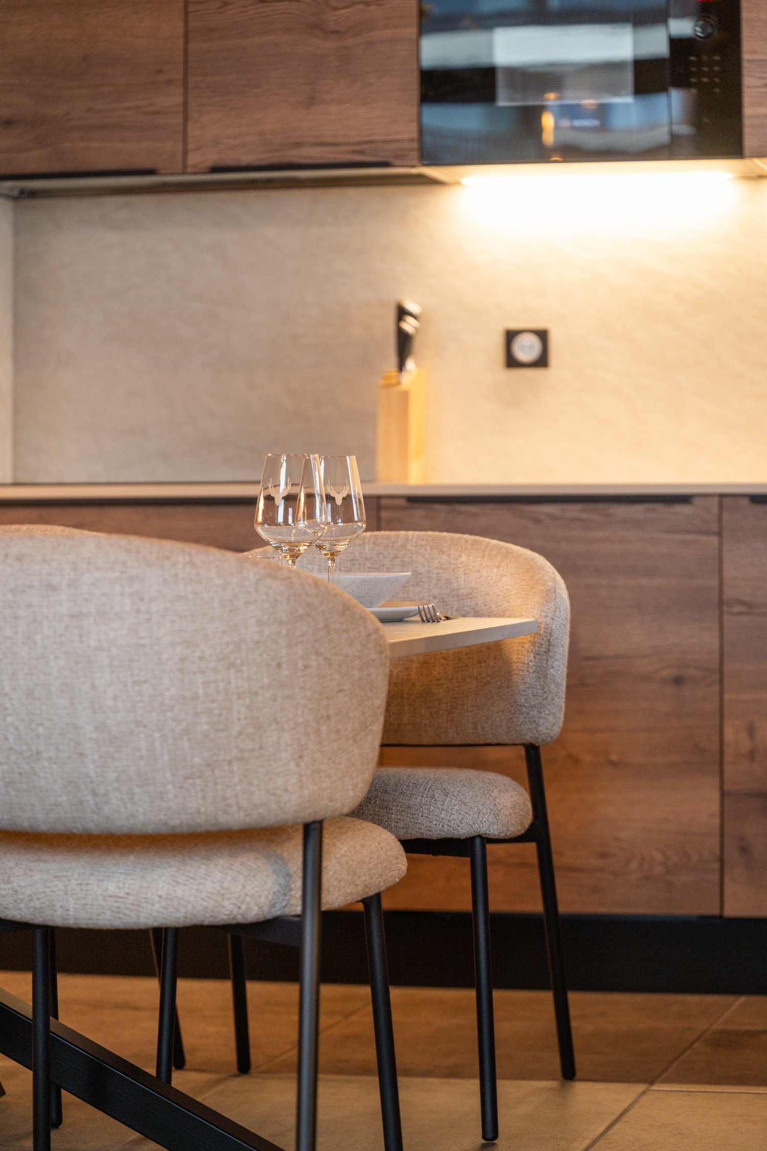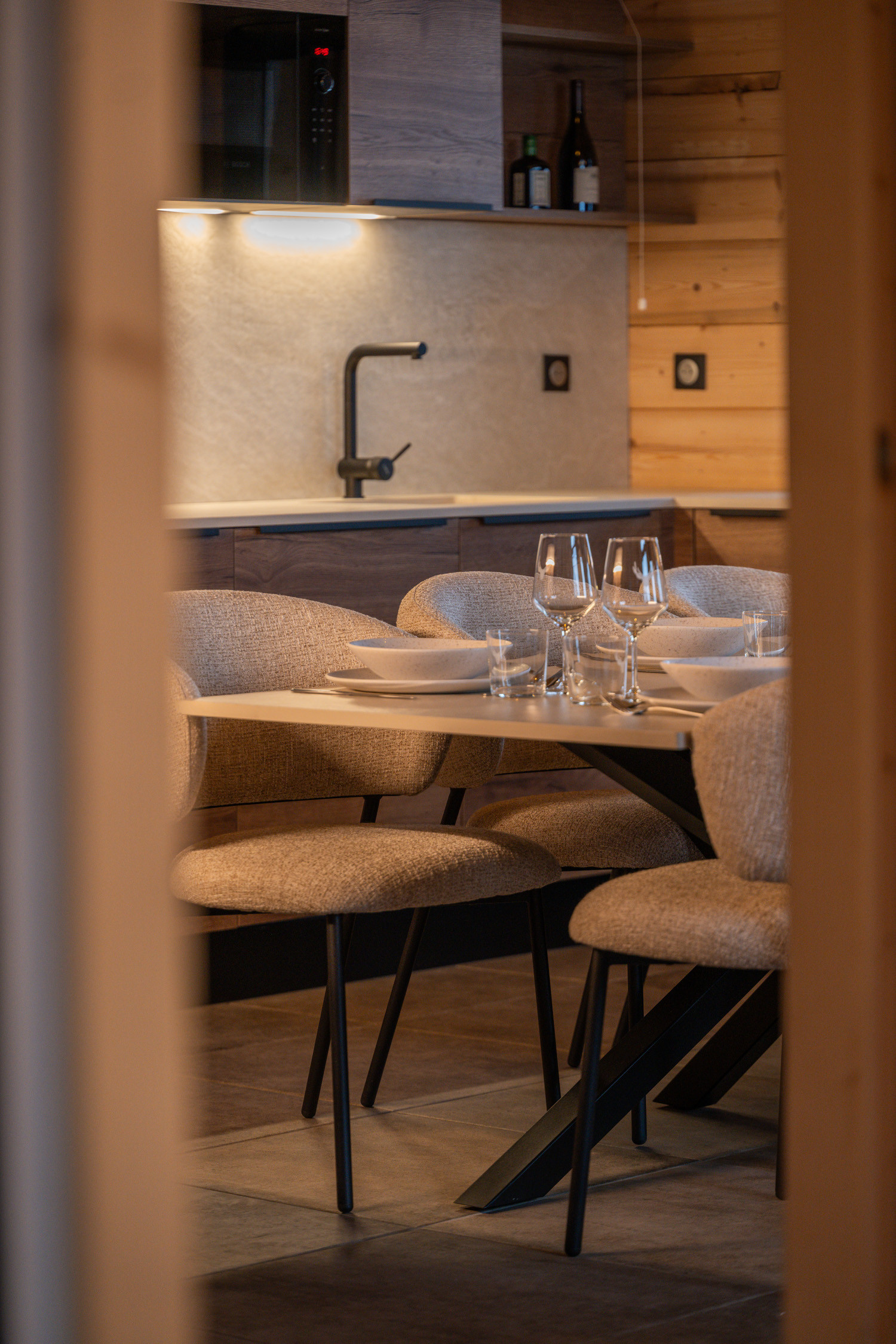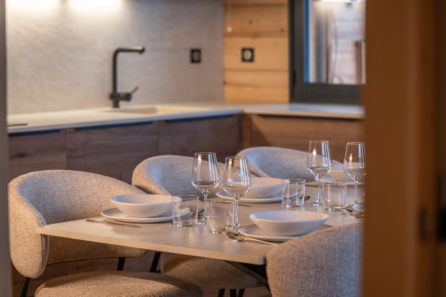 The open-plan kitchen flows into a bright and welcoming living area, benefiting from a lovely south-west exposure. Fully equipped, the kitchen offers everything you need for a comfortable stay: oven, microwave, dishwasher, filter coffee machine and Nespresso machine, as well as fondue and raclette sets.