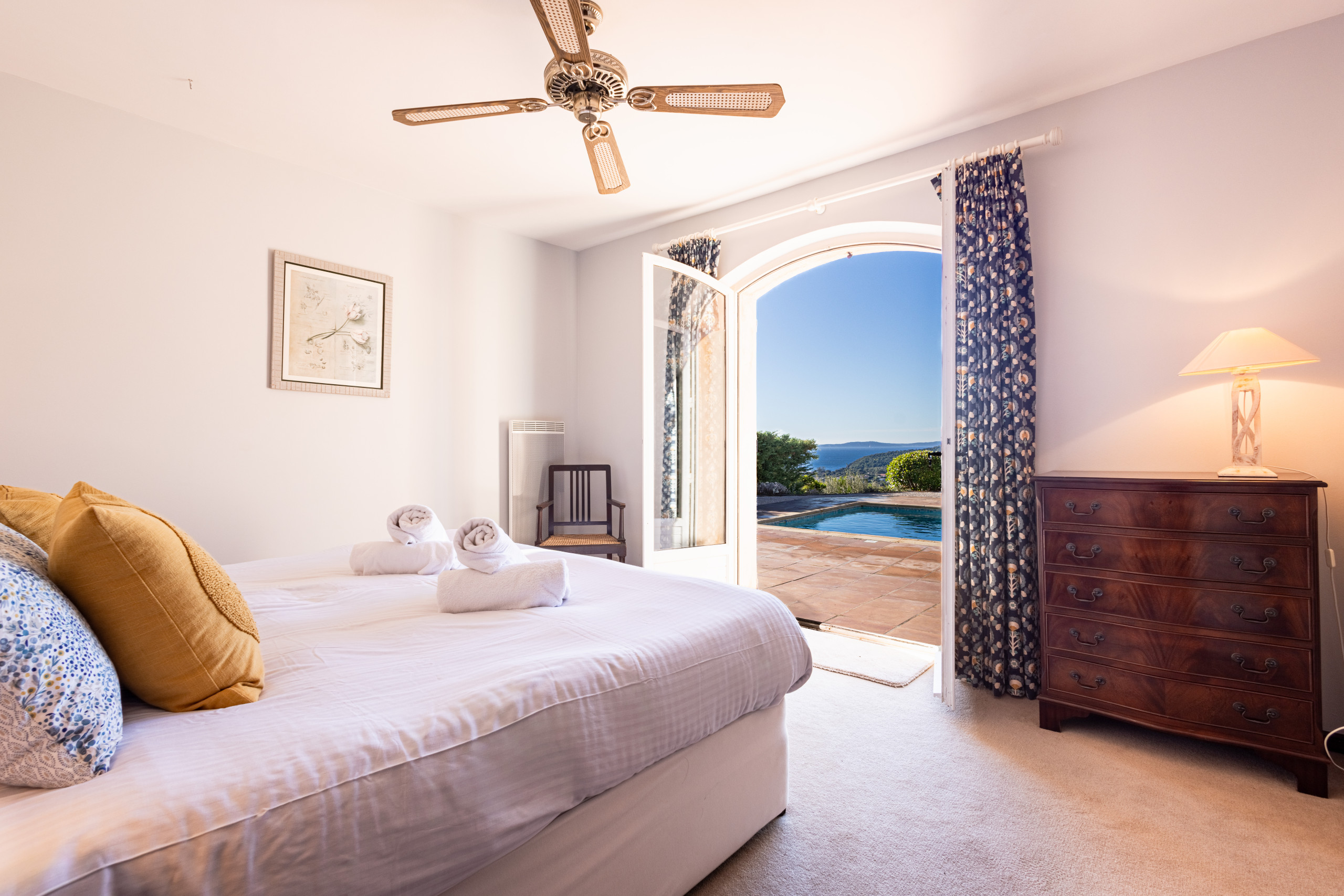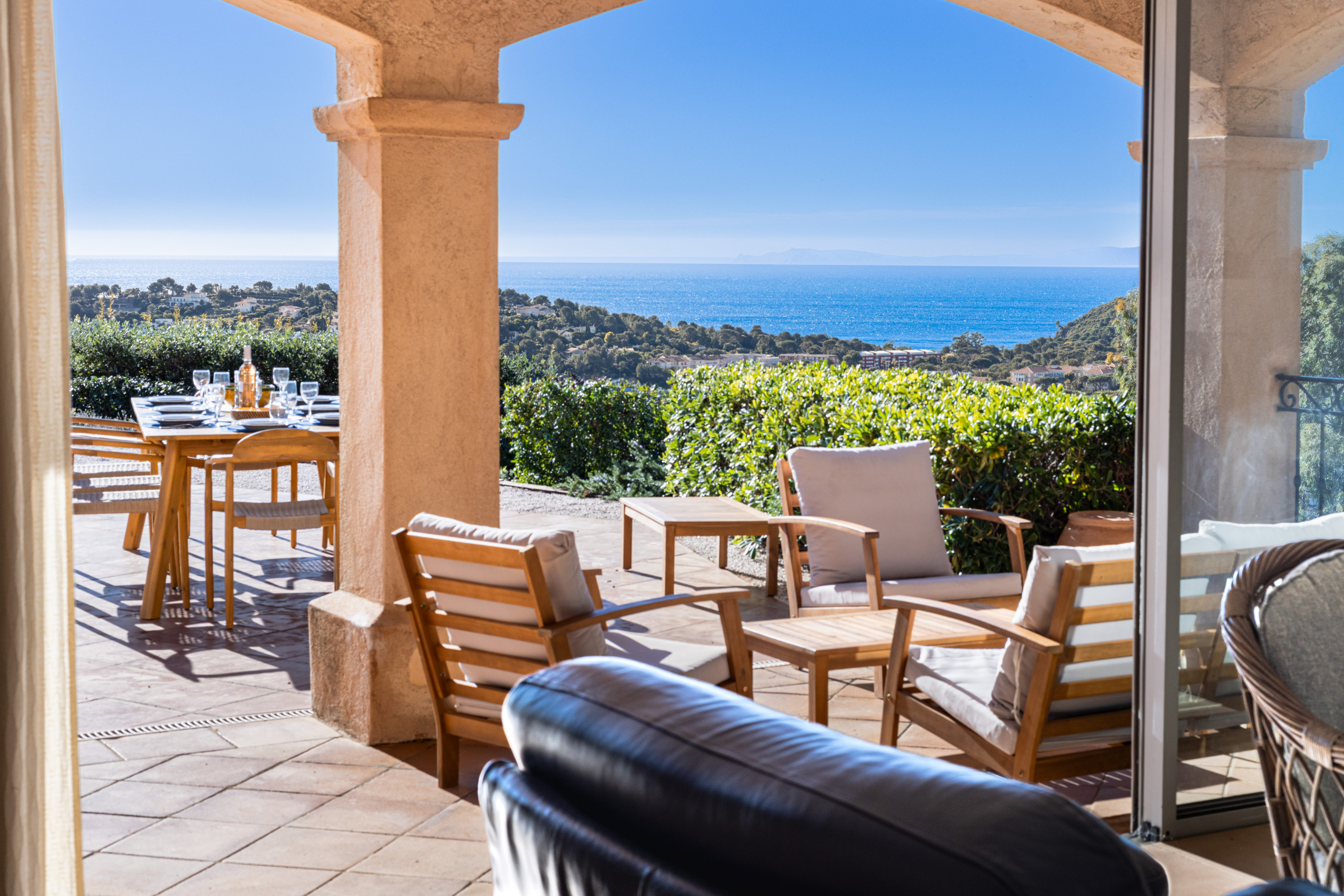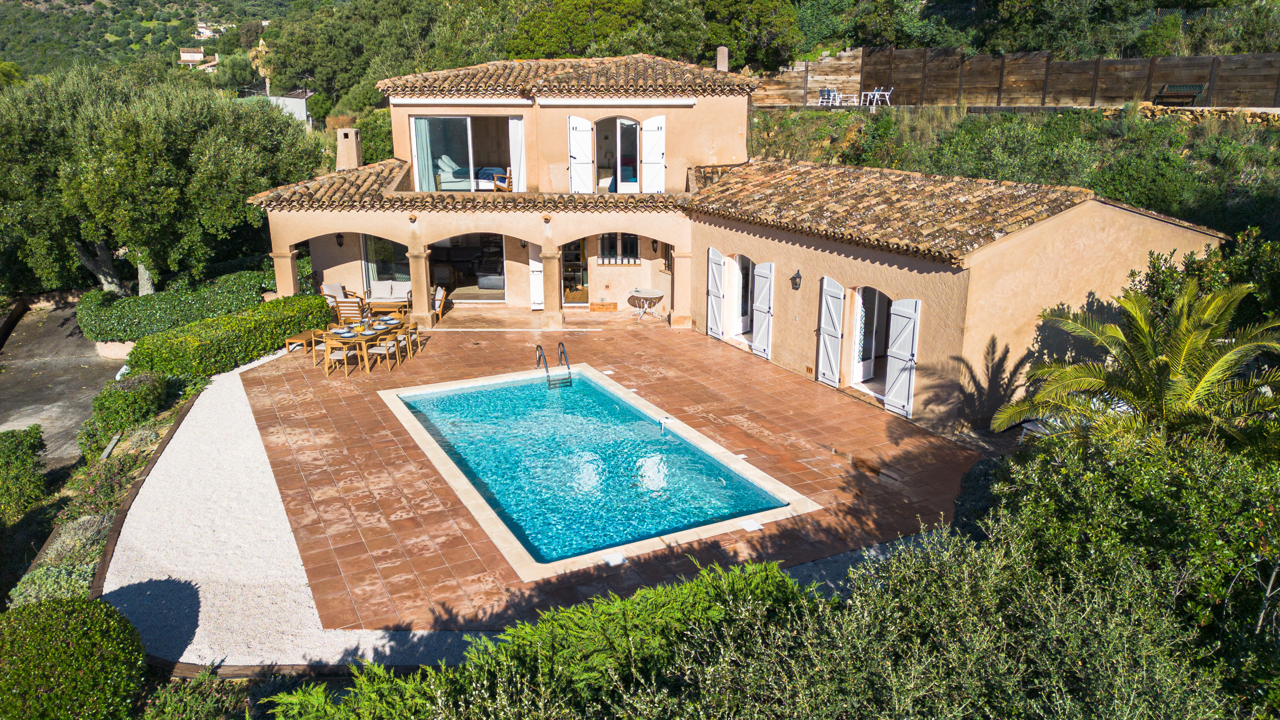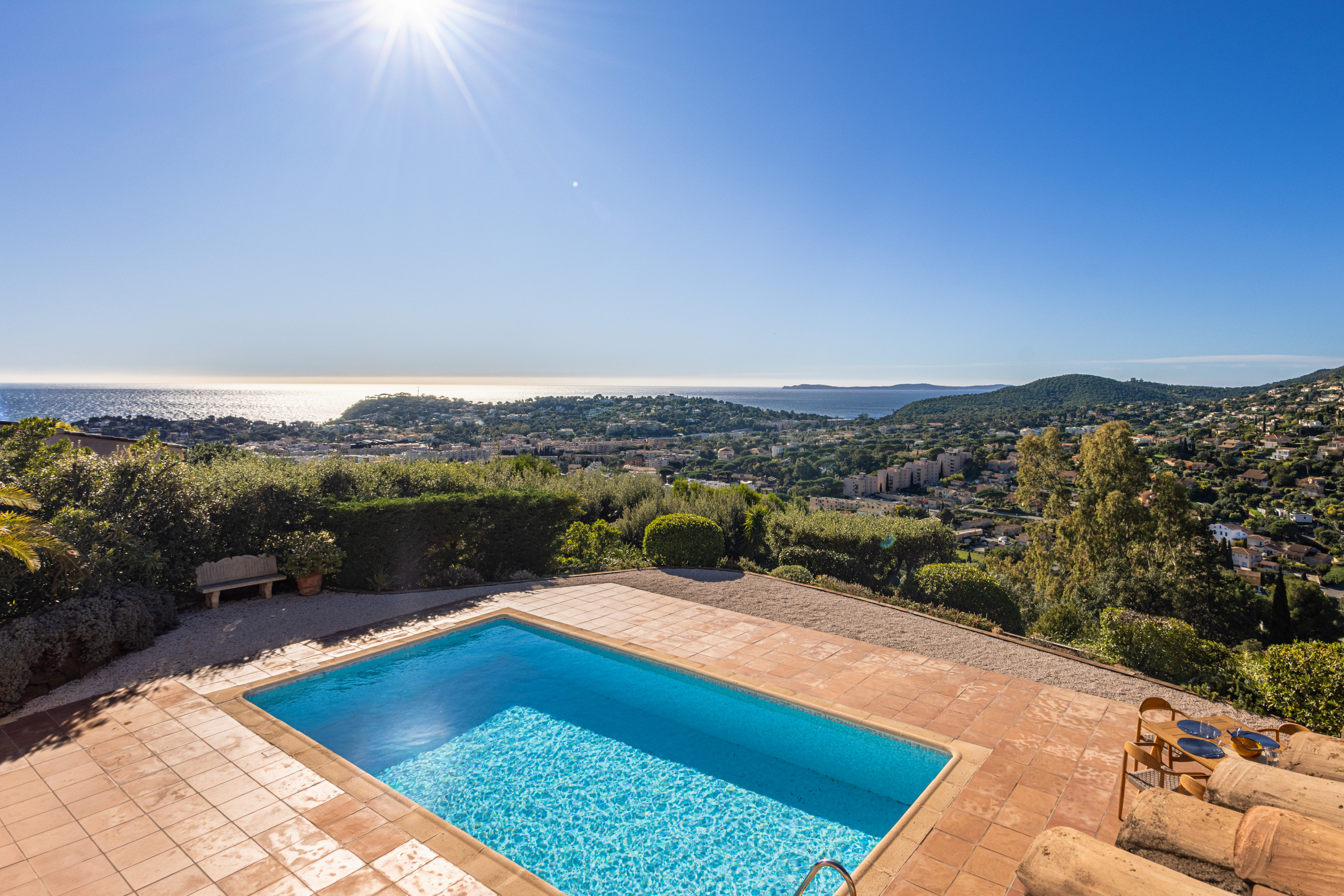 Outside, the villa reveals a superb open-air living space: a swimming pool with sea view, ideal for cooling off while admiring the panorama, as well as a private pétanque court, perfect for sharing convivial and typically Provençal moments at the end of the day. Each moment spent outside becomes an invitation to relaxation, between sunshine, blue horizon and Mediterranean sweetness of life.